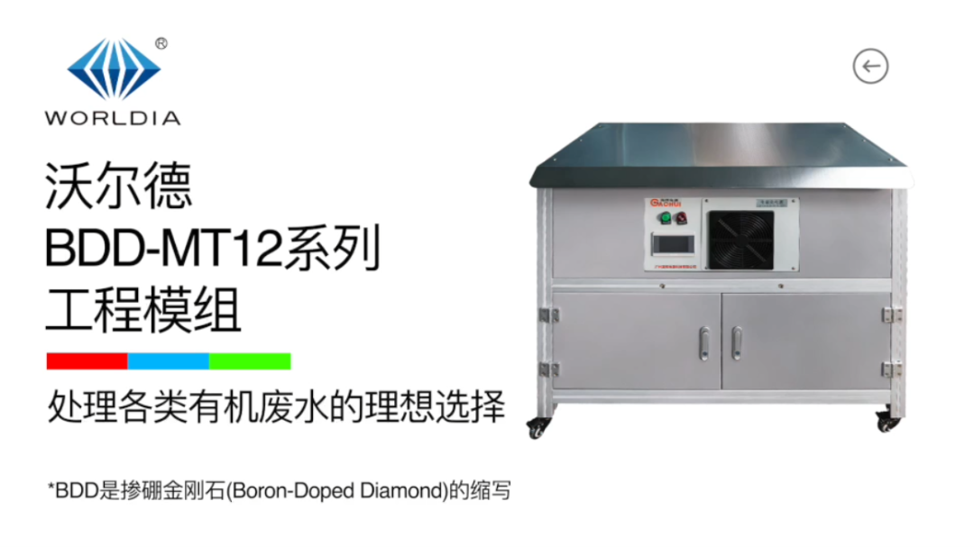 沃尔德BDD-MT12系列工程模组是采用电化学氧化法,处理高盐、高毒性、高浓度、强酸碱、难降解工业有机废水,高效降解COD、去除氨氮的一体化高级氧化废水处理装置。可为高难废水的处理提供从中试到工程化应用的全流程研发支持,是在国内率先实现了大尺寸、大面积BDD电极工业化应用的设备。