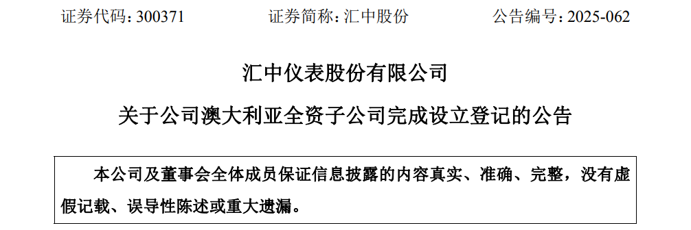 近日,汇中仪表股份有限公司(简称:汇中股份)发布公告,汇中股份拟使用自有资金对外投资设立澳大利亚全资子公司,投资金额不超过 2,000 万元人民币或等值外币。
